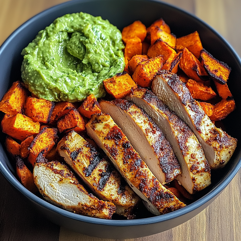 Grilled Chicken Power Bowl with Spiced Sweet Potato Wedges & Avocado Cream