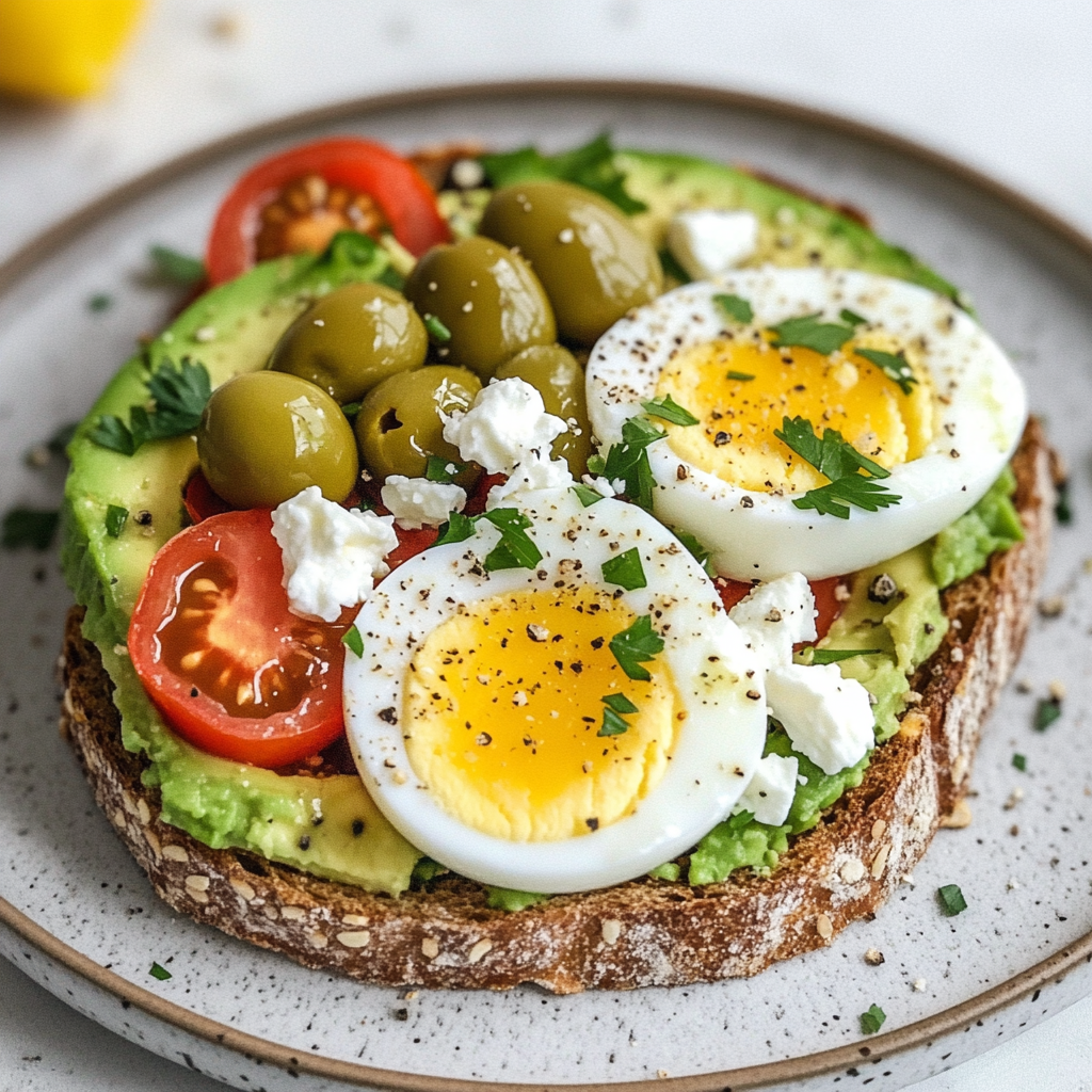 Mediterranean Egg & Avocado Toast with Feta, Olives & Tomatoes