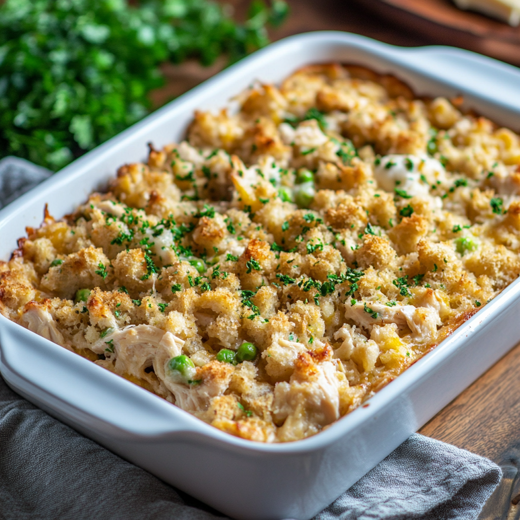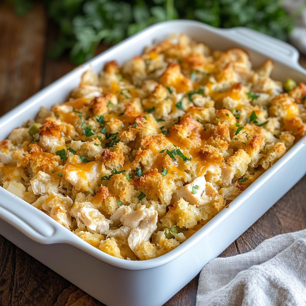 Dolly’s Chicken and Stuffing Casserole is a comforting meal made with shredded chicken, savory stuffing mix, creamy soups, and optional cheese.