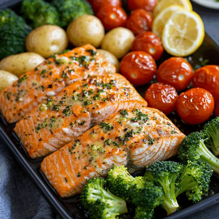 Garlic Butter Salmon with Roasted Veggies & Baby Potatoes is a delightful dish that combines rich flavors and vibrant colors, making it perfect for any occasion. This recipe elevates your dinner experience with succulent salmon fillets coated in a fragrant garlic herb butter, accompanied by tender baby potatoes, juicy cherry tomatoes, and crisp broccoli. Whether it’s a weeknight meal or a special gathering, this dish is sure to impress.
