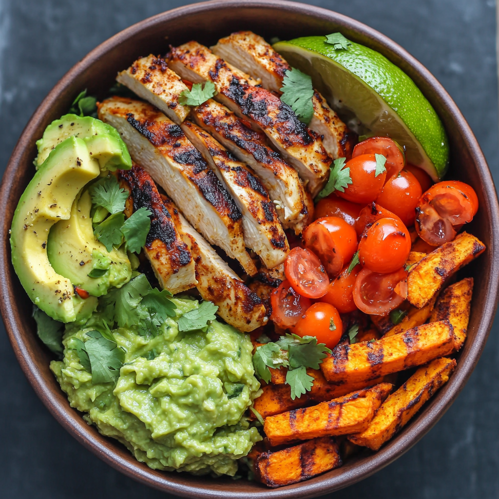 - Assemble your power bowl by layering sweet potato fries, grilled chicken slices, avocado slices, cherry tomatoes, and cilantro. Serve with guacamole and lime wedges.