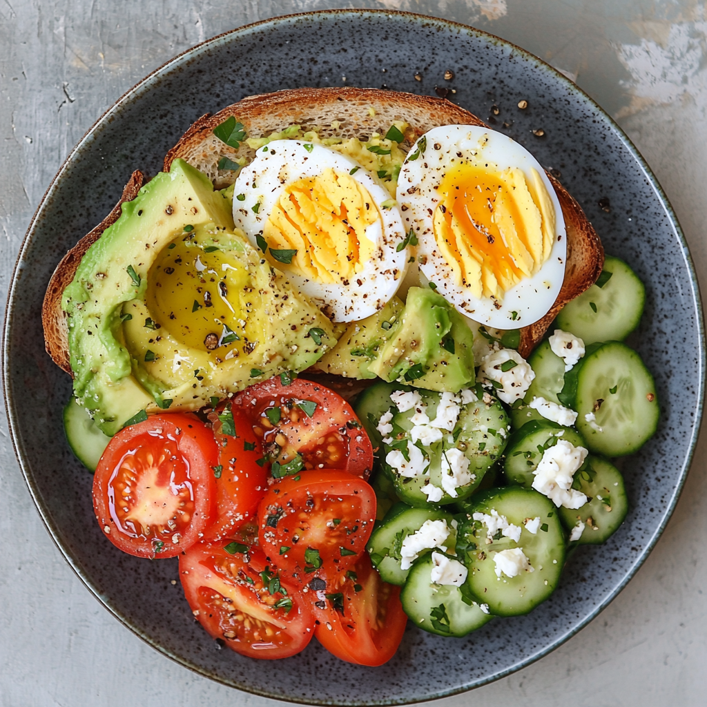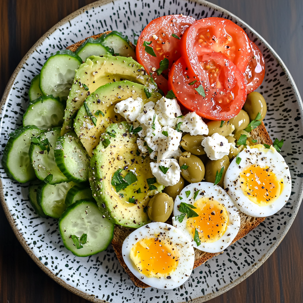 - Assemble the plate by placing the avocado toast next to the halved eggs. Add cucumber slices, feta cubes, olives, and sprinkle with herbs, salt, and pepper.