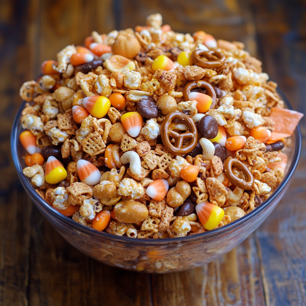Enjoy your Scarecrow Crunch Snack Mix as a delightful treat at your next celebration!