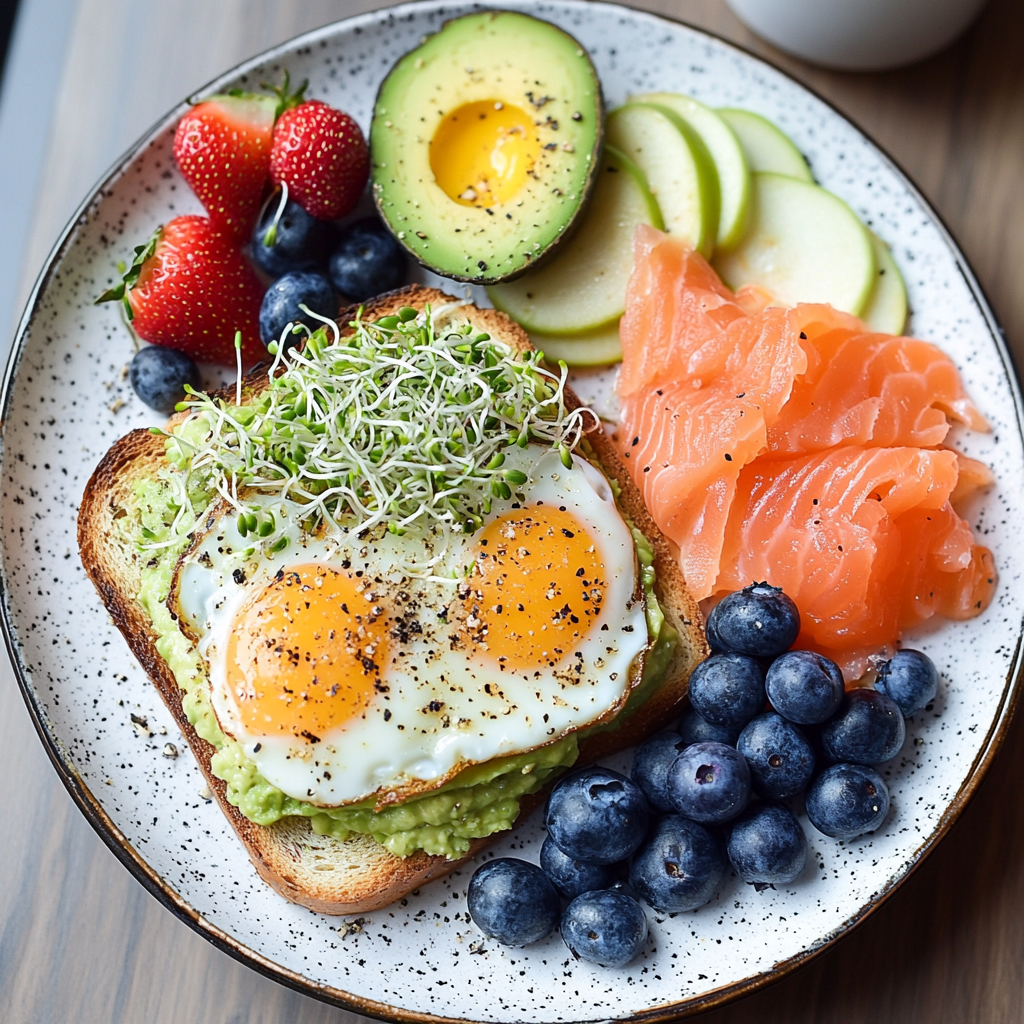Top each slice of avocado toast with fried egg and arrange smoked salmon slices on top. Finish off with a generous sprinkle of fresh sprouts for added crunch and nutrition.