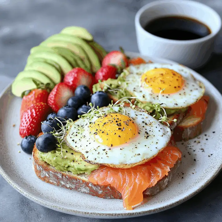 Start your day on a delicious note with this Smoked Salmon & Avocado Breakfast Toast with Fresh Fruit. This delightful recipe features creamy avocado spread atop crispy, toasted whole grain bread, layered with savory smoked salmon and topped with fried eggs for added richness. Accompanied by a refreshing side of seasonal fruits like blueberries, strawberries, and crisp apple slices, this breakfast is not only satisfying but also packed with essential nutrients. Perfect for busy mornings or lazy weekends, you can whip it up in just 15 minutes!