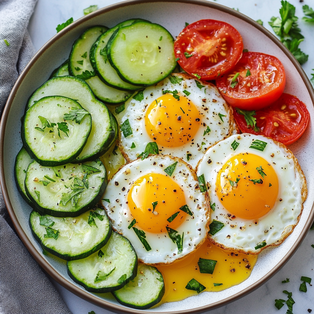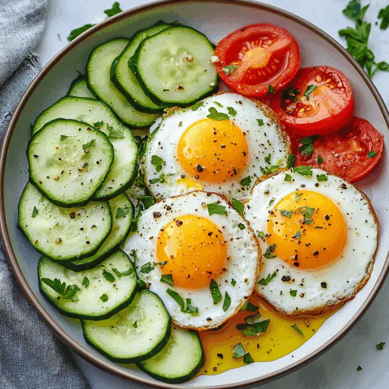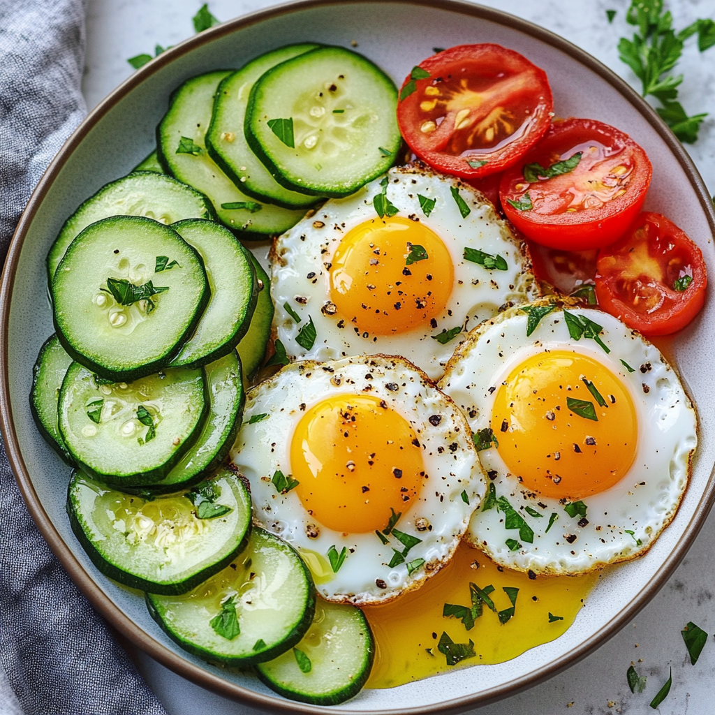 A Sunny Egg & Veggie Plate with Cheese & Herbs is a vibrant and nutritious dish that brightens up any meal. This delightful plate features sunny-side-up eggs complemented by fresh herbs and paired with juicy tomatoes, crunchy cucumbers, and seared zucchini rounds. Topped off with slices of semi-hard cheese, it’s perfect for breakfast, brunch, or a light lunch. Enjoy the balance of protein and veggies while treating your taste buds to a burst of flavor!