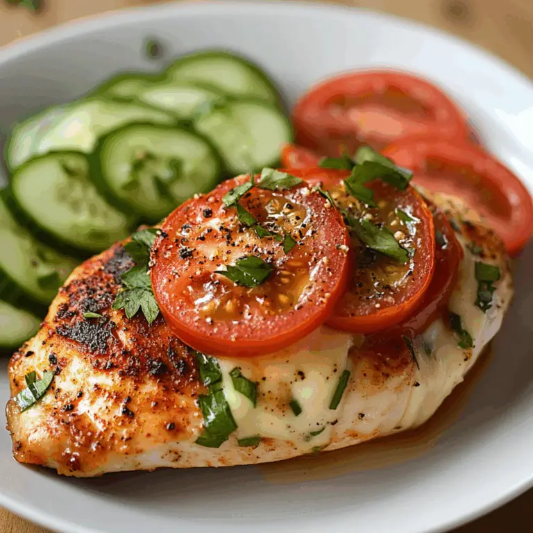 Experience a burst of flavor with our Tomato & Cheese Stuffed Chicken Breast paired with a refreshing Cucumber-Tomato Salad. This delicious dish features tender chicken breasts filled with juicy tomatoes and melted cheese, making it a satisfying option for lunch or dinner. The salad adds a crisp, vibrant contrast to the richness of the chicken, creating a well-balanced meal that’s perfect for any occasion. With easy preparation steps and wholesome ingredients, this recipe is not only delightful but also an excellent choice for meal prep. Enjoy it warm or at room temperature for a versatile dining experience.